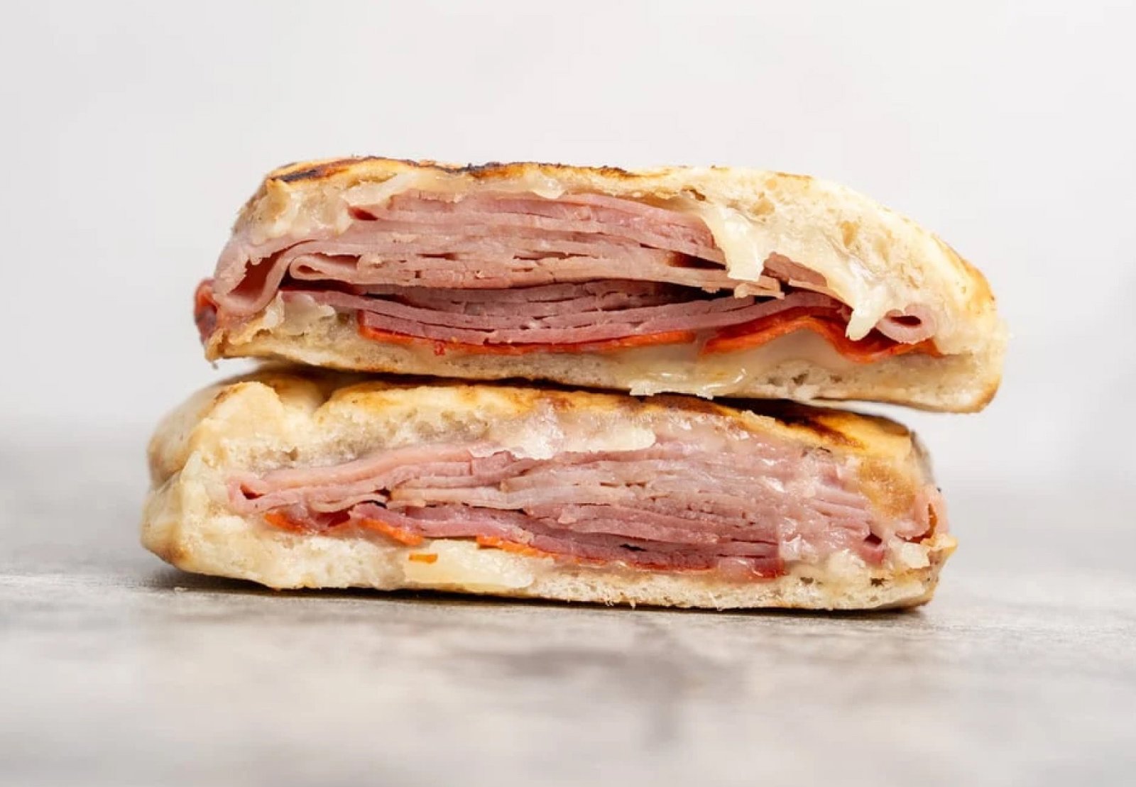 This grilled sandwich is served on white bread with bacon and melted cheese.