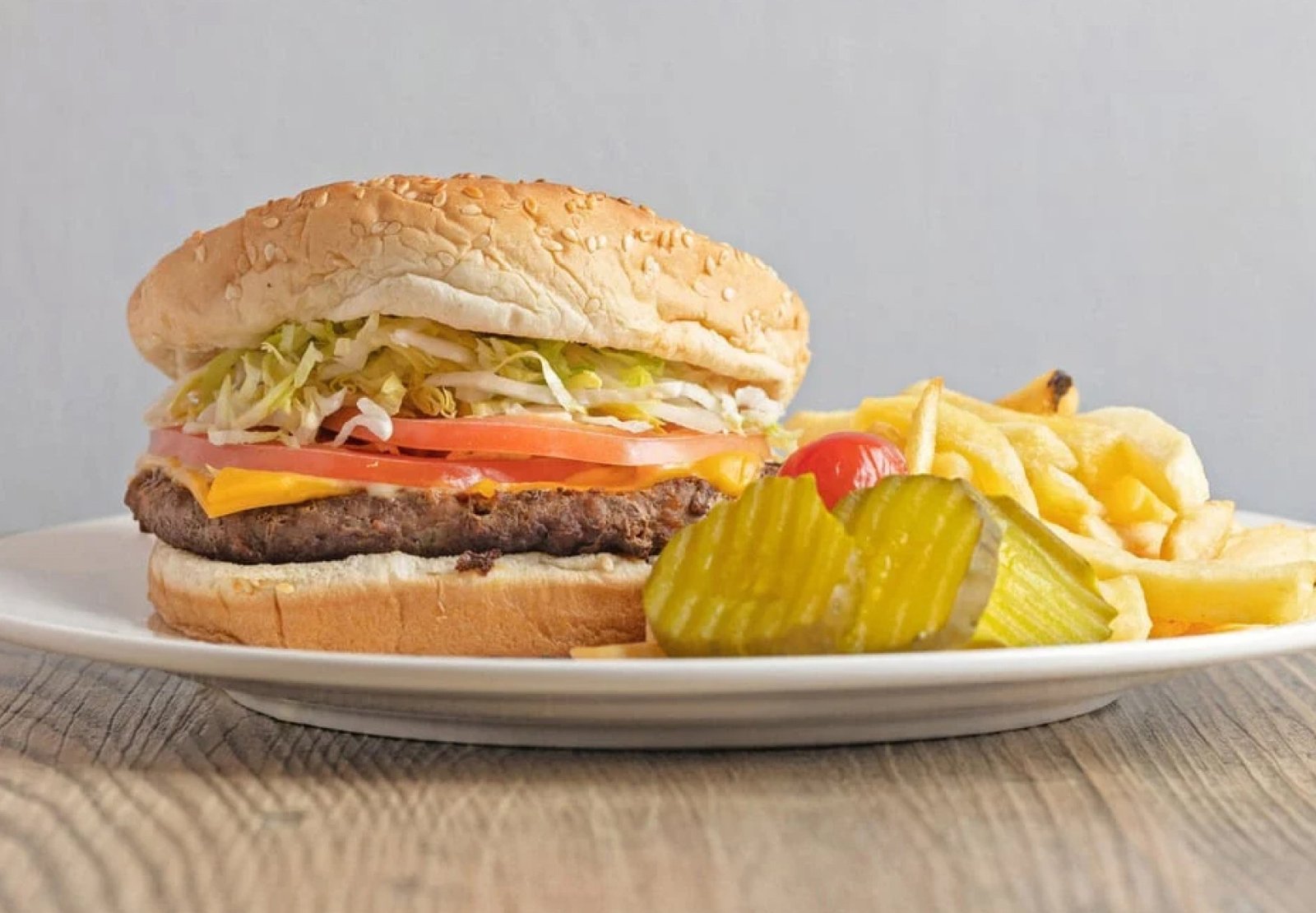 A bacon and cheese burger consists of a juicy beef patty on a fresh bun, topped with cheese and bacon.
