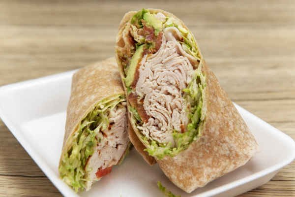 A wrap filled with oven gold turkey, avocado, lettuce, swiss cheese, and tomato with ranch dressing.