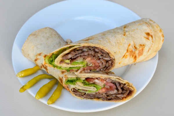 A wrap with roast beef, turkey, American cheese, lettuce, tomato, and Russian dressing.